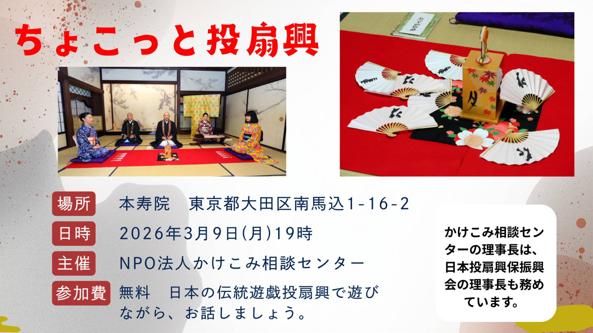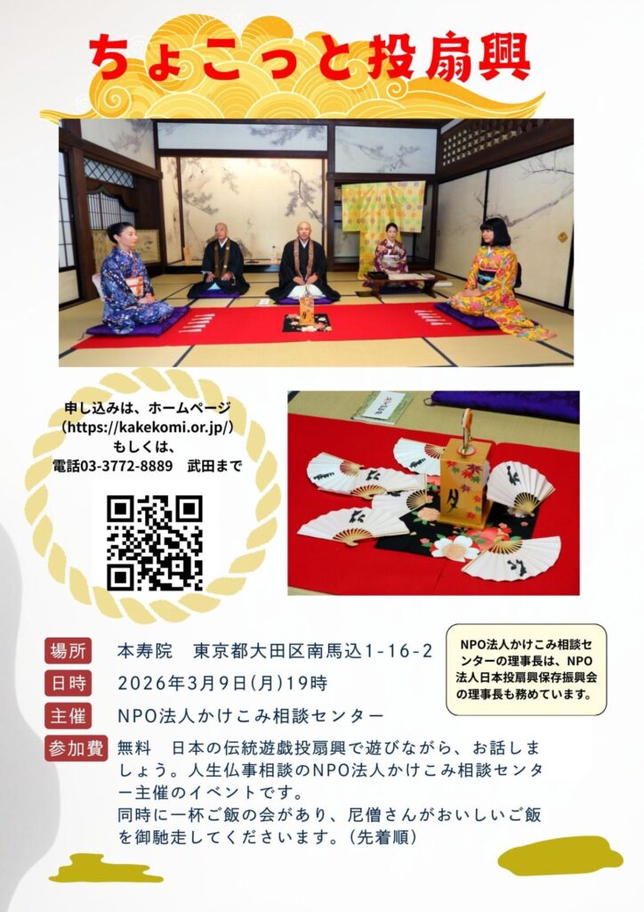 今回は、当NPO法人かけこみ相談センター三浦尊明理事長が兼務しております、NPO法人日本投扇興保存振興会も協力して、「ちょこっと投扇興」を開催させていただきます。(ちょうど、先日日経新聞にも掲載されました)